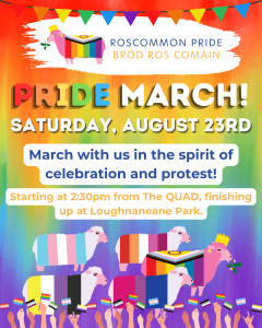 The Roscommon Pride March will take place on Saturday 23rd March at 2.30pm. This is the centre of our weekend – a powerful moment where we come together in the spirit of celebration and protest. The march will begin at the Quad in Roscommon Town.